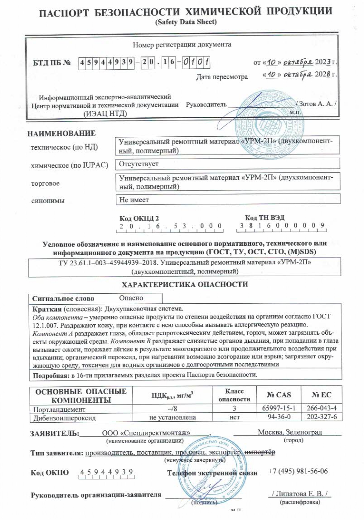 Для проектировщиков, инженеров и технических специалистов доступна официальная техническая документация на универсальный ремонтный материал ПОЛИДАБЕР УРМ-2П.